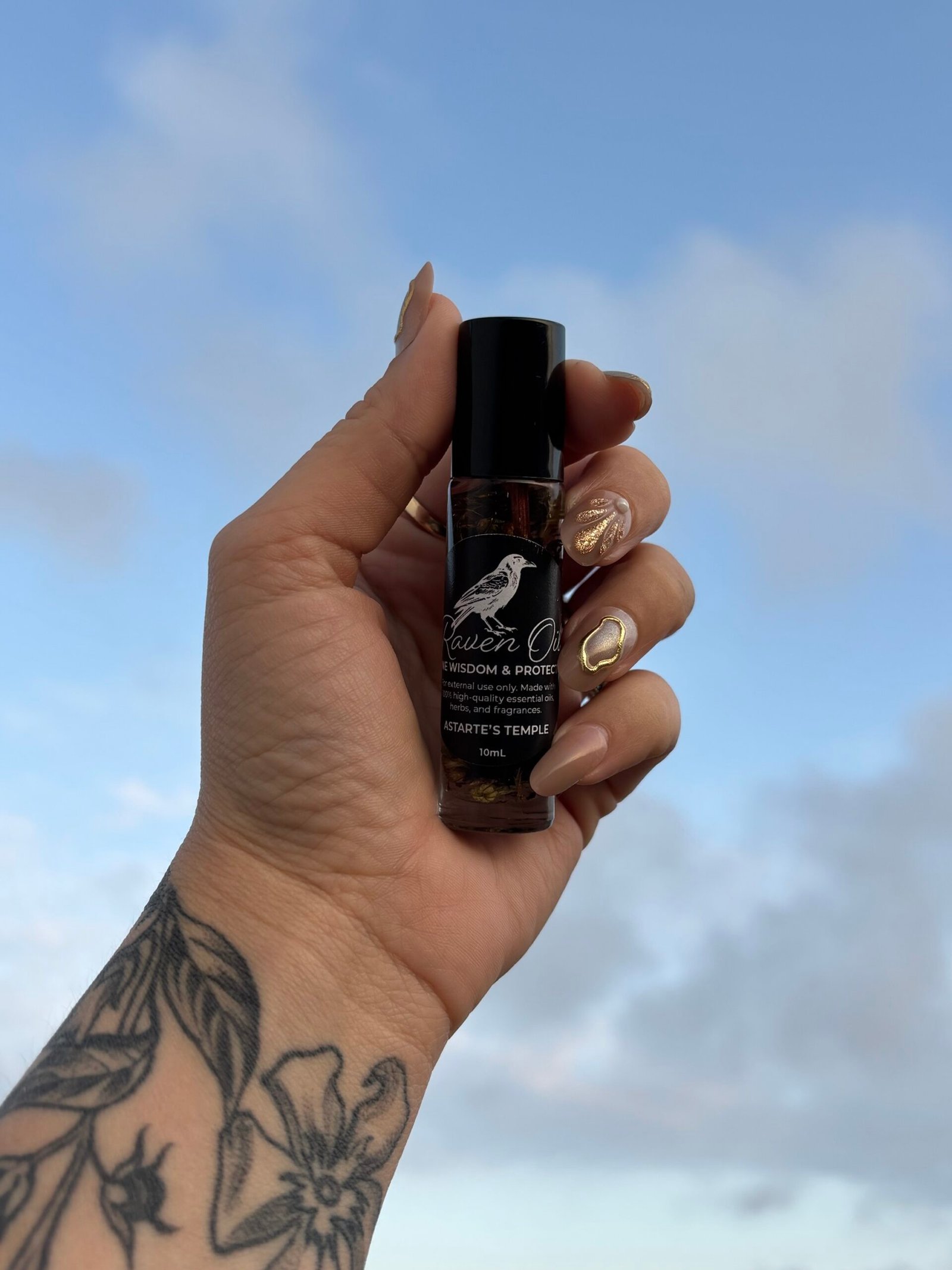 Hand-crafted wearable ritual oil for divine wisdom and protection. Made with skin-safe, non-comedogenic oil, essential oils, fragrance, and herbs. 10mL roller ball.